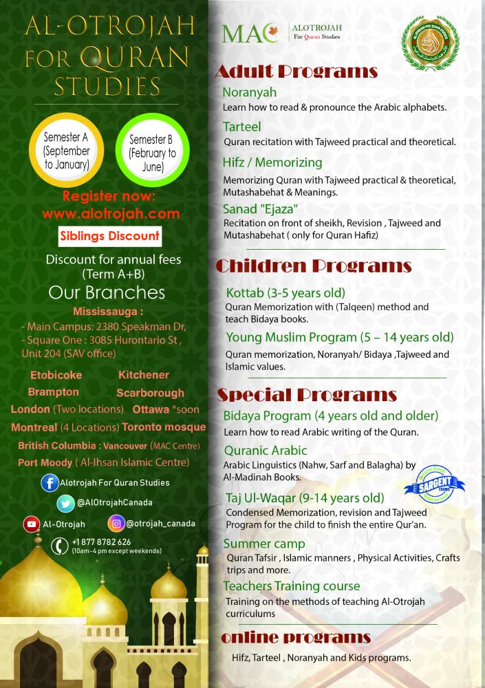 Al-Otrojah Academic Year 2019/2020 registration has opened, Adults, Youth and Kids Quran Programs on Campus and Online are available continue reading