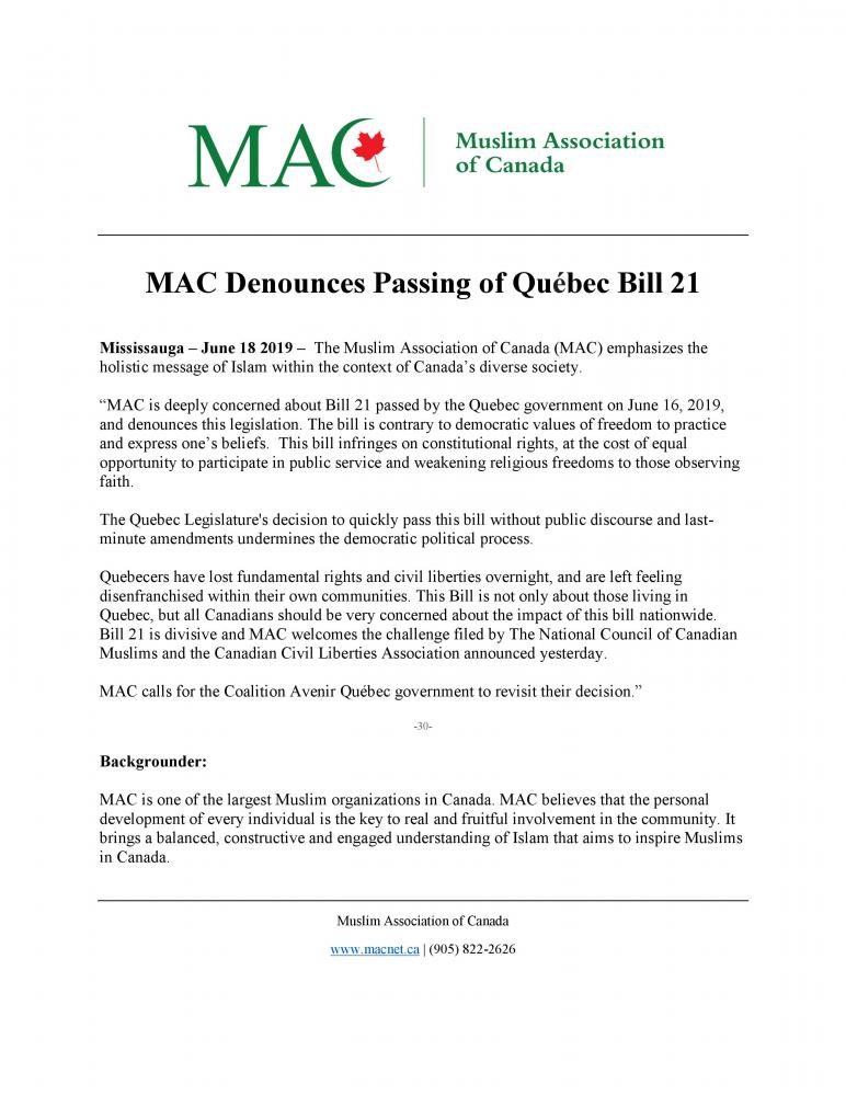 Passing of Bill21 an Affront to Canadian Pluralism & Quebec Values