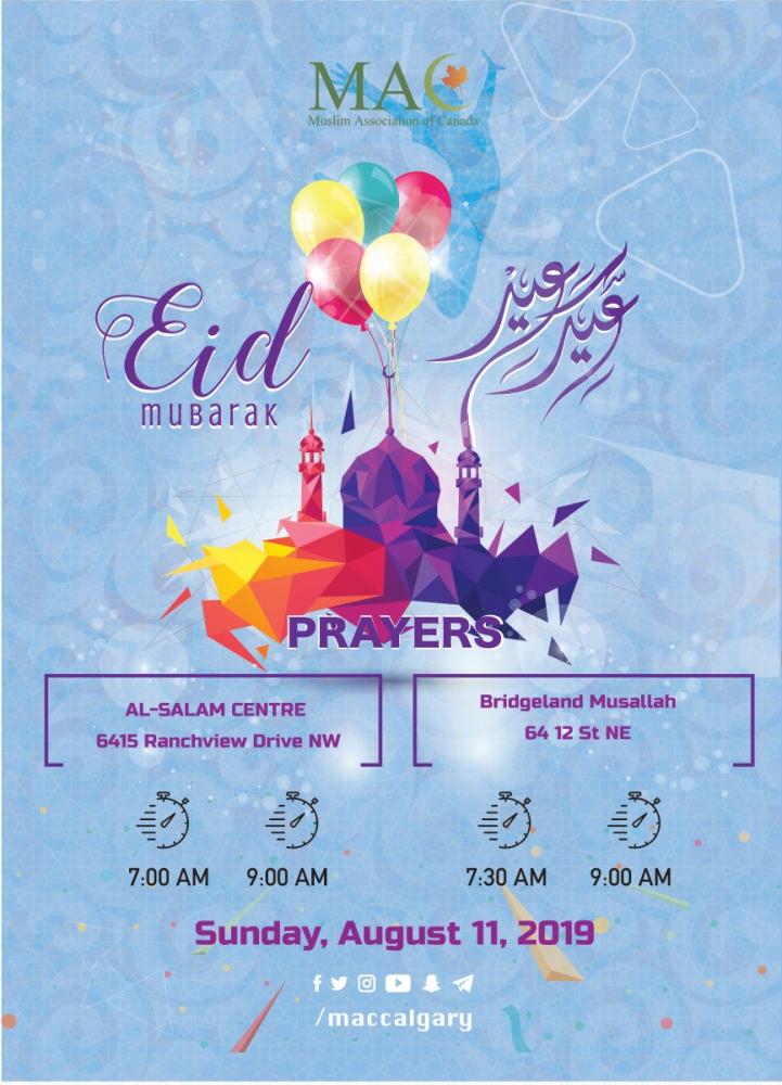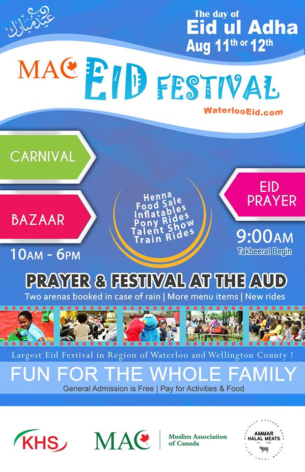 Eid prayers and festivals are among the longest established Muslim Community events in Toronto and across Canada. The first one was held in Toronto in 1975. MAC is organizing prayers in all its centres and special festivals in major cities (flyers below for details); Ottawa, Toronto, Montreal, Calgary, Windsor, and Kitchener).